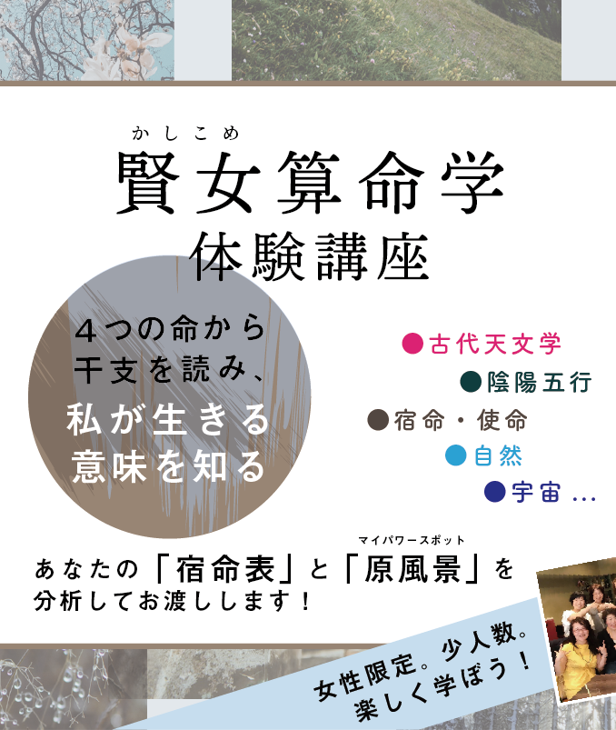 年に2回しか開催されない、「賢女算命学体験講座」が 10月11日(日)に開催されることとなりました! 講座でどんなことを学べるのかなど、講座の詳細は >>こちらのページでご紹介しております。 超初心者〜初心者の方向けの講座となります。 お席が埋まりつつありますので、 気になっていた方、ピンときた方は、ぜひお早めにお申し込みくださいませ。 賢女算命学体験講座 日時:10月11日日曜日 13:00〜17:00(開場:12:40) 料金:10,000円 女性限定、定員8名様となります。 主催:日本支援助言士協会 申し込み: >>主催元の詳細ページよりお申し込みください