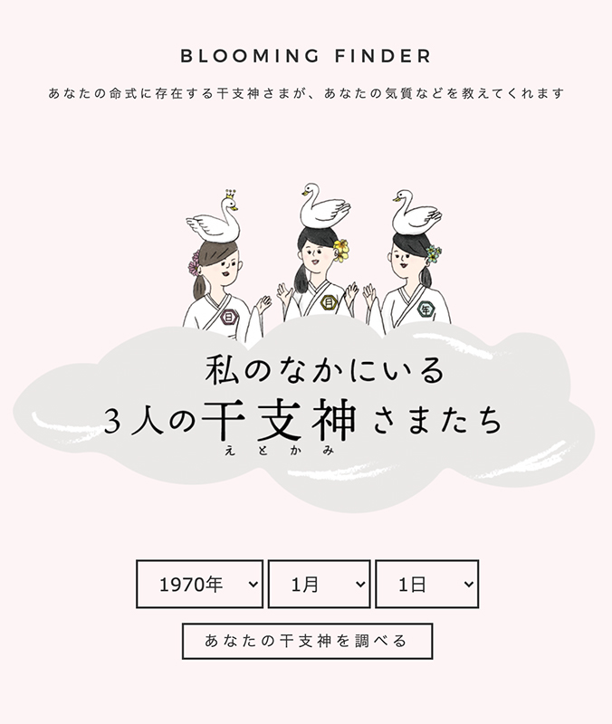 あなたの干支神がわかる、その名も「BLOOMING FINDER」が、新たに干支花のWebサイトに登場しました! サイトのトップページからアクセスいただけます。 「BLOOMING FINDER」は、あなたの中にいる3人の干支の神様がどんな方達なのかがしっかりとわかるツール。 あなたの命式に存在する干支神さまが、あなたの気質などを教えてくれます! 3人の干支神さまの素質には、本当のあなたを花開かせるためのヒントが盛り沢山。 だから、BLOOMING -花咲く、と名が付きました。 あなたの、そしてあなたの大切な人の干支神様がどんな方が、ぜひ調べてみてくださいね! 結果はというと…? たとえば、こんな感じに表示されます ↓ それぞれの干支神様の粋なネーミングも要チェックですよ!