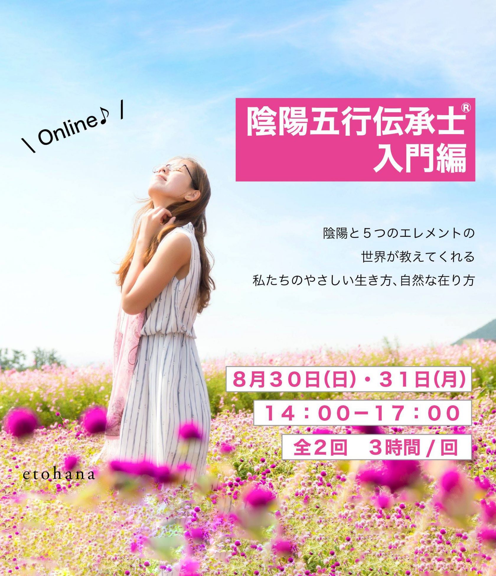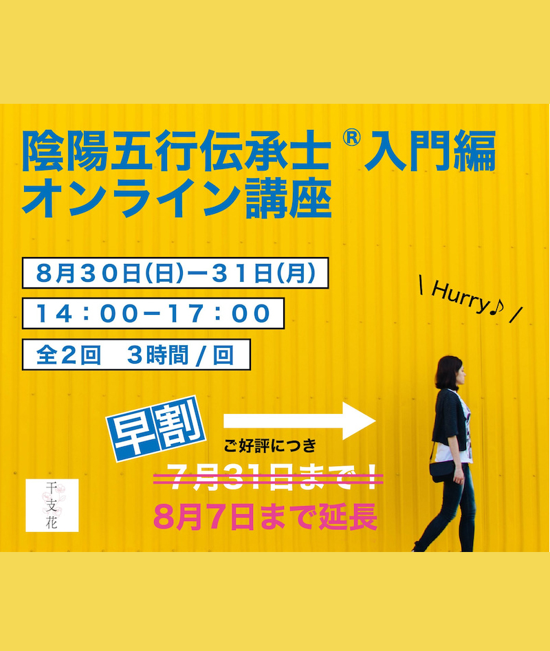 「陰陽五行伝承士® 入門講座」について、8月の開講が決まりました〜! 今回は、オンライン化しての対応となりますので、 多くのみなさまに受講いただく機会となればと思っております。 この講座は、陰陽五行についての超入門編。 内容については、こちらのページでじっくり語っていますので、ぜひご覧ください。 講座でどんなことを学べるのかなど、講座の詳細は >>こちらのページでご紹介しております。 陰陽と5つのエレメント(木火土金水)の世界が教えてくれる 私たちのやさしい生き方、自然な在り方。 もっと生きるのが、軽くなるために、もっと自分らしく、心地よい人生を送るために、 「陰陽五行」の考え方を一度じっくり学んでみませんか?   陰陽五行伝承士® 入門講座   日時:2020年8月30日(日)/31日(月)14:00〜17:00  ※2日間の開催 料金:38,500円(税…