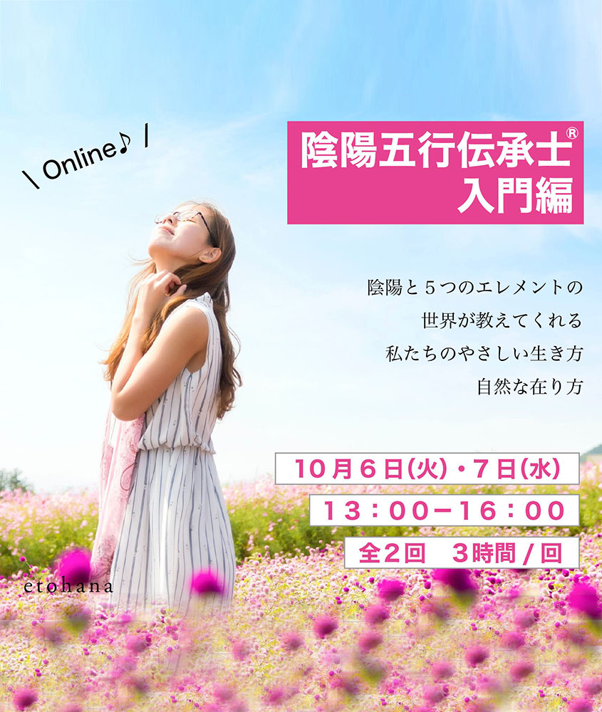 「陰陽五行伝承士® 入門講座」について、8月つづいて10月の開講が決まりました〜! 10月は、リクエストにお応えし、平日開催となります! 前回に続き、オンライン開催となりますので、 多くのみなさまに受講いただく機会となればと思っております。 この講座は、陰陽五行についての超入門編。 内容については、こちらのページでじっくり語っていますので、ぜひご覧ください。 講座でどんなことを学べるのかなど、講座の詳細は >>こちらのページでご紹介しております。 前回から新たなご感想も追加しておりますので、ぜひご覧ください! 陰陽と5つのエレメント(木火土金水)の世界が教えてくれる 私たちのやさしい生き方、自然な在り方。 もっと生きるのが、軽くなるために、もっと自分らしく、心地よい人生を送るために、 「陰陽五行」の考え方を一度じっくり学んでみませんか?   陰陽五行伝承士® 入門講座…